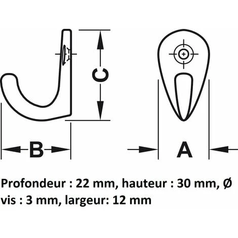 Profondeur : 22 mm, hauteur : 30 mm, Ø vis : 3 mm, largeur: 12 mm, avec un trou de fixation