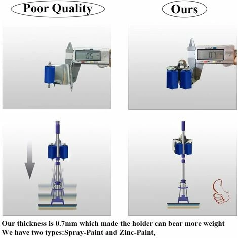 l’épaisseur du porte balais mural est de 0.7 mm au lieu de 0.4 mm comme la plupart des acroche balai sur le marché, ce qui signifie que notre attache balai mural peut charger plus de poids