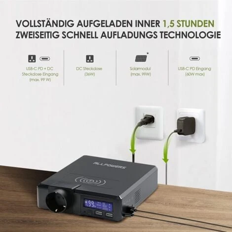 - 【4 méthodes de charge】 : mode 1, station de puissance ALLPOWERS peut être chargée via une alimentation CA de 36 W maximum. Mode 2, peut être rechargé par un panneau solaire (non inclus) avec un maximum de 99 W. Mode 3, il peut être utilisé avec un max. Adaptateur PD 65W à charger via le port USB-C Mode4, il peut être chargé avec une puissance de 99 W via Mode 1 + Mode 3 et se recharge complètement pendant 1,5 heure.