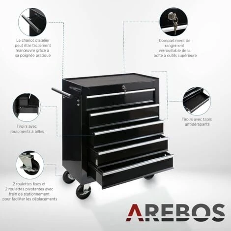 - Notre chariot d’atelier AREBOS est équipé d’un total de 5 tiroirs