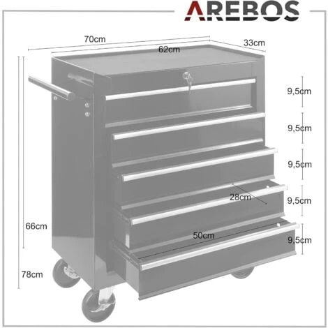 [PARFAITEMENT ÉQUIPÉ] Le chariot à outils AREBOS est équipée de 5 tiroirs | Fabriqué en acier massif | Plan de travail robuste et résistant aux rayures | Les tiroirs avec glissières à roulement à billes et tapis antidérapants permettent aux outils de rester en place et évitent les cliquetis lorsque le chariot est déplacé