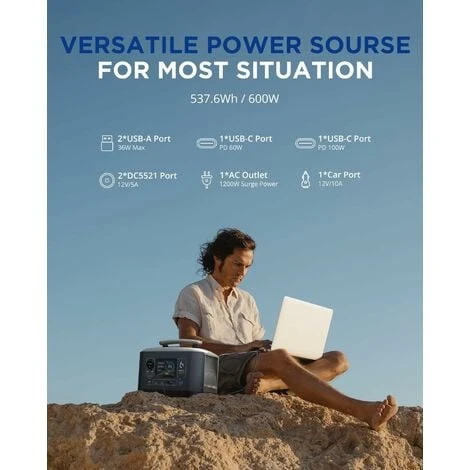 (puissance de pointe de 1200W) [PLUSIEURS SORTIES ELECTRIQUES] 1 * prise 230V CA pour les appareils de moins de 600W (puissance de pointe de 1200W)/onde sinusoïdale pure, 1 * port PD 60W, 1 * port PD 100W, 2 * ports USB-A à charge rapide, 2 * prises CC 12V/5A, 1 * port voiture 12V/10A