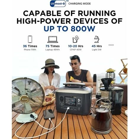 pour les accessoires de la voiture. Maintenez vos appareils chargés avec un générateur d’extérieur qui alimente jusqu’à quelque 800W grâce à la technologie de charge unique Utmost-B(Boost-up) [4 MANIERES DE RECHARGER] La recharge peut s’effectuer via une prise de courant alternatif, un panneau solaire, une prise de courant de voiture ou des ports USB-C Prend en charge la charge rapide en courant alternatif qui prend seulement 1,6 heure pour