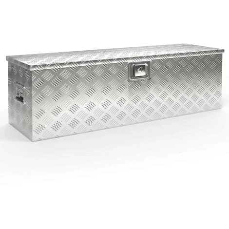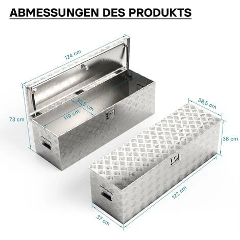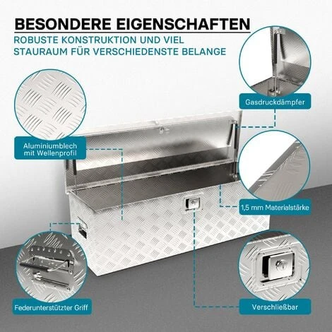 La grande caisse à outils est en tôle ondulée en aluminium. L’aluminium en tant que matériau se caractérise par un faible poids et une haute résistance à la corrosion. Les récipients en aluminium sont faciles à nettoyer. En outre, le matériau offre un aspect élégant à la caisse.