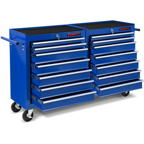 Le chariot possède une finition haut de gamme ainsi que 14 tiroirs placés sur des glissières téléscopables à roulements et équipés de tapis antidérapants. Lors de la fermeture, les tiroirs se verrouillent afin de ne pas souvrir par mégarde lors de déplacements. Un cadenas permet de verrouiller le chariot datelier et protège vos outils contre tout accès non autorisé.