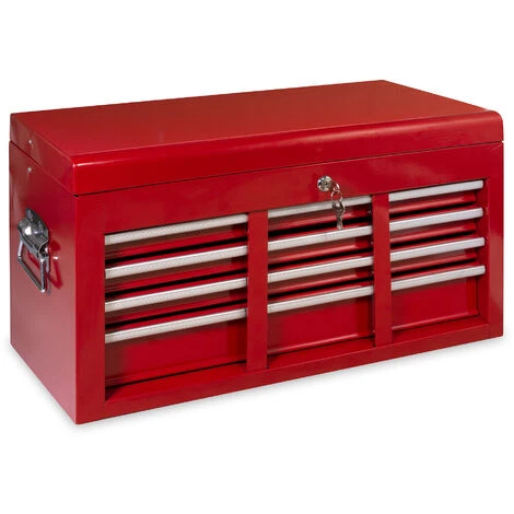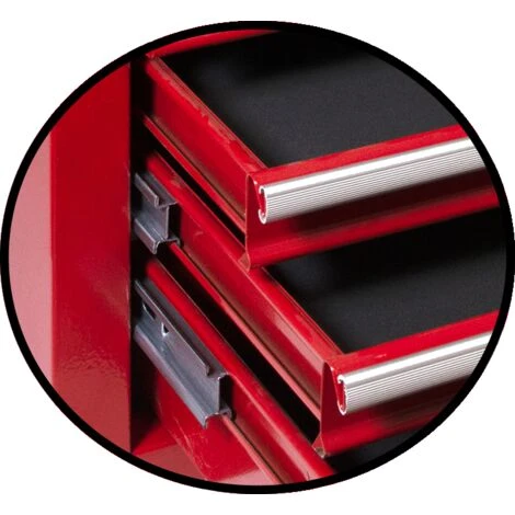 Coffre à outils 6 tiroirs avec 2 poignée fixées par rivets renforcés – Tiroirs sur double glissière – 6 tiroirs (3 grands et 3 petits) – 2 barre anti-ouverture pour le transport – Grande trappe supérieure – Dimensions 736*60*26 cm – Poids total vide: 11kg – Poids outillage supporté: maxi 25 kg