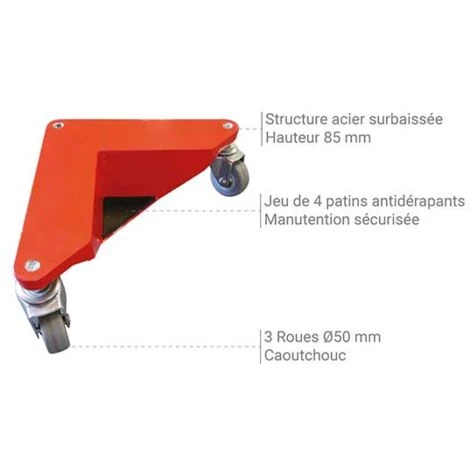 – Grâce aux 3 roulettes pivotantes en caoutchouc, la charge est très facilement manœuvrable dans toutes les directions