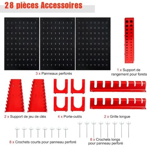 - 【Rangement Multifonctionnel: 】 16 crochets à panneau perforé à une seule inclinaison de 2 longueurs différentes conviennent aux outils avec des trous pouvant être suspendus. Quatre porte-outils à double inclinaison peuvent être utilisés pour ranger les marteaux et les pinces. Deux supports de jeu de clés à 10 positions peuvent contenir des clés de différentes longueurs. Il existe également des organisateurs correspondants pour les perceuses et les tournevis.