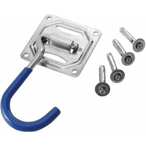 Crochet de rangement cycle mural ; Crochet repliable avec revêtement plastique afin de protèger la jante ; Fixation par 4 vis/chevilles (inclus) ; Diamètre crochet = 55mm ; Longueur totale (position ouverte) = 155mm ; Platine de fixation = 88x88mm ;