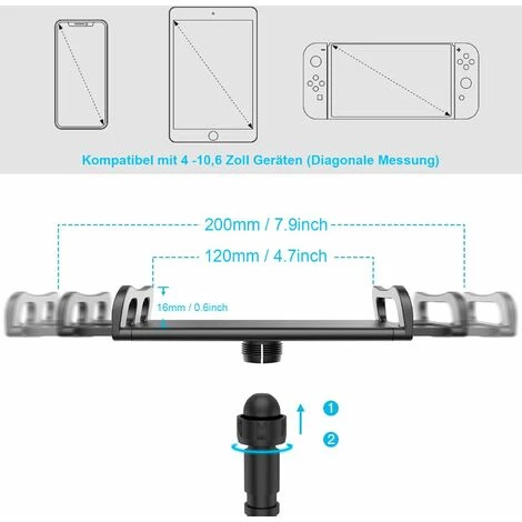 La pince convient à différentes tailles de l’appareil de 4 à 11 pouces, par ex. iPad Air, iPad Mini 4, iPad 4/3/2/1, iPad Pro 10.5 / 9.7, iPhone X / 8 plus / 7 plus, Fire HD 10/8/7, Huawei Mediapad M3 / T3, Google Nexus 7/10 , Samsung Galaxy S10 / S9 / S8 plus / note 8 / A5 / Galaxy Tab A / Tab S3, Nintendo Switch, Kindle etc.