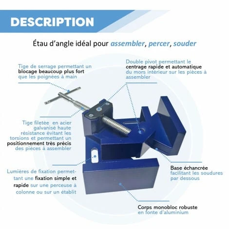 - [ CONCEPTION INTELLIGENTE ] : Idéal pour les travaux d’assemblage, de perçage et de soudure, cet étau d’angle à double pivot permet le serrage, à angle droit 90°, de pièces identiques ou de tailles différentes. Professionnel ou bien amateur, travaillez en toute sécurité grâce au dispositif de fixations ajustables, pour un positionnement aisé du serre joint angulaire sur une table de perceuse à colonne, ou sur un établi.