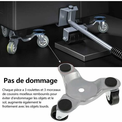 FONCTION ANTIDÉRAPANTE:Chaque pièce a 3 roulettes et 3 morceaux de coussins moelleux rembourrés pour éviter d’endommager les objets et le sol, augmente également le frottement avec les objets lourds.Le kit de transport de meubles utilise le principe de