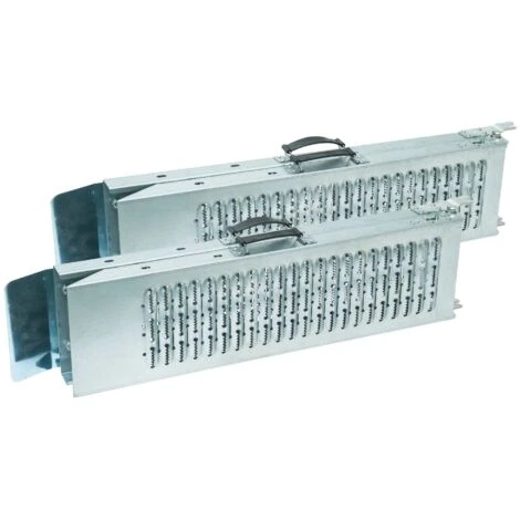 Description détaillée du produit: Longueur d’une rampe: 1,6 m Largeur d’une rampe: 22,5 cm Capacité de charge: 200 kg par rampe Stable et robuste Acier galvanisé résistant à la corrosion Angle au sol coupé Design anti-dérapant Pliable avec une poignée de transport sur chaque rampe S’adapte à tous les types de remorques Vendu par lot de 2 rampes