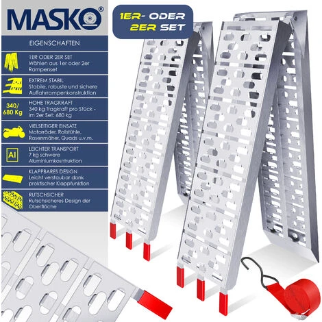 Contenu de la livraison 1x rampe d’accès ALU 340 kg* courbée avec une « surface antidérapante » supplémentaire 1x sangle avec crochets métalliques stables pour la fixation au véhicule 1x manuel d’utilisation illustré