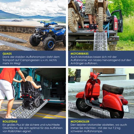Dotée d’une surface antidérapante, celle-ci peut supporter une charge de 340 kg* (par rampe). (max. 680 kg* par paire). La rampe d’accès peut être utilisée seule ou en lot de 2. La rampe est idéale pour charger par exemple des tondeuses à gazon, des scooters, des engins de chantier, etc. . Légère, polyvalente et mobile – vous n’avez pratiquement aucune limite.