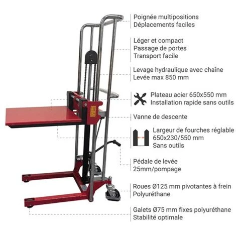 – Modèle de gerbeur conçu pour les professionnels profite d’un système d’élévation hydraulique pour un usage récurrent.