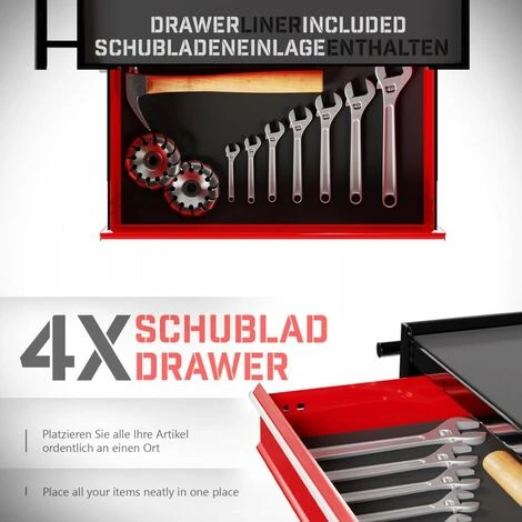 Des solutions de rangement pratiques sont l’ajout parfait à tout lieu de travail ou à domicile. Une bonne organisation est synonyme d’une meilleure efficacité. Gardez votre atelier ou lieu de travail organisé à l’aide de ce chariot à outils. Fabriqué en acier durable et résistant, ce chariot vous servira pendant de nombreuses années.Informations techniques:Chariot à outils avec 5 tiroirsDimensions totales (L/l/H): env. 61,5x33x77,5 cmDimensions sans roulettes (L/l/H): env. 61,5x33x65,5 cmDimensions du tiroir (L/l/H): env. 50x28x9,5 cmÉtagère supérieure (L/l/H): env. 61×32,5×1,5 cmCharge max: env. 75 kgPoids: env. 22 kgMatériaux: Construction en acierRoulettes en polypropylèneCouleur: rouge-noirAutres informations importantes: Verrouillable (2 sets de clés)4 roulettes pivotantes (2 avec frein)Tapis de protection inclusRemarque: les dimensions des tiroirs se réfèrent à leur taille intérieure.étendue de livraison:1 x Chariot à outils WSTW01 en kit pour un montage à effectuer soi-même2 x Set de clés Installation des roulettes: fixez les quatre roulettes en les insérant simplement dans les trous de montage.Remarque: La décoration n’est pas incluse dans la livraison.Remarque: La livraison de nos produits aux îles n’est pas possible.Remarque: Les couleurs peuvent légèrement différer de celles des images.