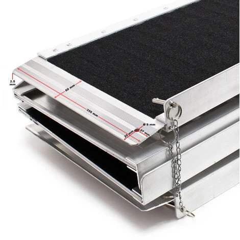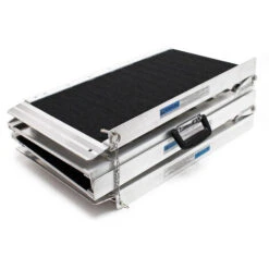 La rampe peut être facilement pliée dans le sens der la longueur grâce à une poignée et portée facilement par un propre poids de 11,3 kg seulement . La rampe dispose d’une capacité de charge de 270 kg. Grâce à son maniabilité facile et domaine d’utilisation flexible , cette rampe vous convaincra très rapidement.