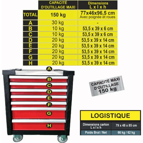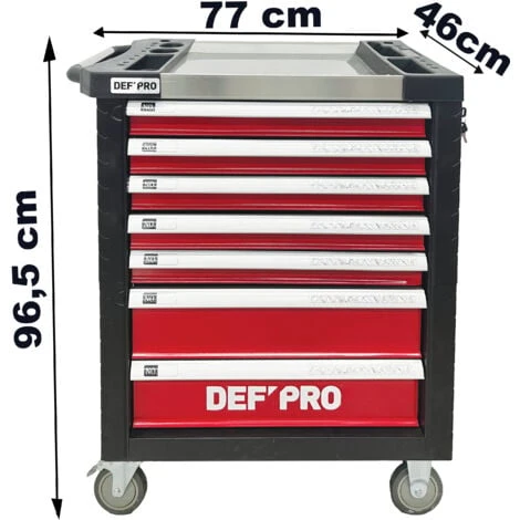 Servante d’atelier pro 7 tiroirs et 5 plateaux d’outils – Compartiments en mousse EVA – Double fermeture tiroirs – Serrure à clé – Plateau préhensible (poignée) – Roues pivotantes (dont 2 avec freins) – Outils compris – Plateau avec poignée et compartiments – Poids NET 68kg – Dimensions 97x78x47 cm