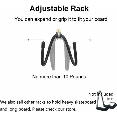 10 livres – Notre support est en métal. Tenez fermement votre skateboard sans vous balancer. Pas plus de 10 livres. Si votre planche pèse plus de 10 livres, veuillez consulter notre magasin. Nous vendons des racks pouvant contenir des planches à roulettes lourdes et de longues planches.