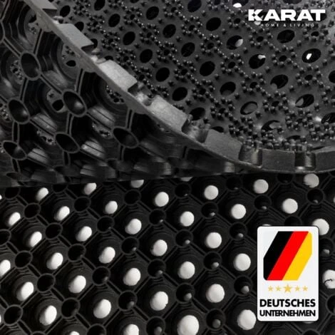L’excellent effet de drainage du tapis alvĂ©olaire en caoutchouc est dĂ» Ă la fois aux grands trous et aux nervures sur la face infĂ©rieure. Les liquides peuvent donc s’Ă©couler de manière optimale et la surface du revĂŞtement de sol en caoutchouc reste toujours propre et sèche. Le caoutchouc naturel de haute qualitĂ© rend Ă©galement le tapis en caoutchouc annulaire très robuste : le revĂŞtement de sol Ă structure alvĂ©olaire rĂ©siste Ă de fortes charges mĂ©caniques et aux intempĂ©ries. Grâce Ă son propre poids Ă©levĂ© et Ă son matĂ©riau, le tapis en caoutchouc reste antidĂ©rapant sur le sol.