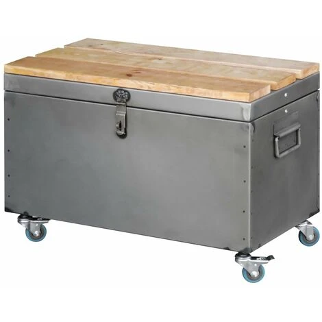 Design industriel pour ce coffre en acier avec couvercle équipé de 3 planches de bois 350 x 100 x 20 mm lui donnant la fonction de tabouret.