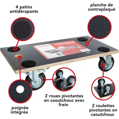 Ce rouleau Ă meubles pratique de Toolland fait le gros du travail Ă votre place. La planche en bois contreplaquĂ© dĂ©place sans effort les meubles et autres objets lourds jusqu’Ă 400 kg. Les quatre roues pivotantes permettent de tourner facilement. Ces roues sont d’ailleurs fabriquĂ©es en caoutchouc souple, ce qui rĂ©duit les bruits de roulement. Et grâce au frein intĂ©grĂ©, vous pouvez bloquer le monte-meubles si nĂ©cessaire.