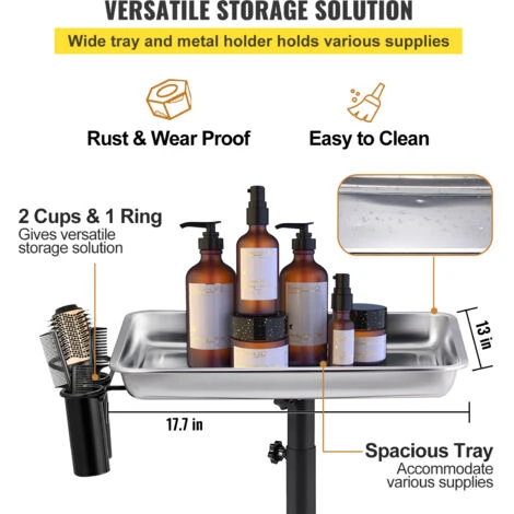 - Plateau Spacieux & Large : Le large plateau argent mesure 45 x 33 cm, donnant une grande surface pour ranger vos outils et toutes vos autres fournitures. Concu avec un porte-outils (2 coupelles et 1 anneau pour seche-cheveux), pour ranger vos seche-cheveux, brosses, peignes, etc.
