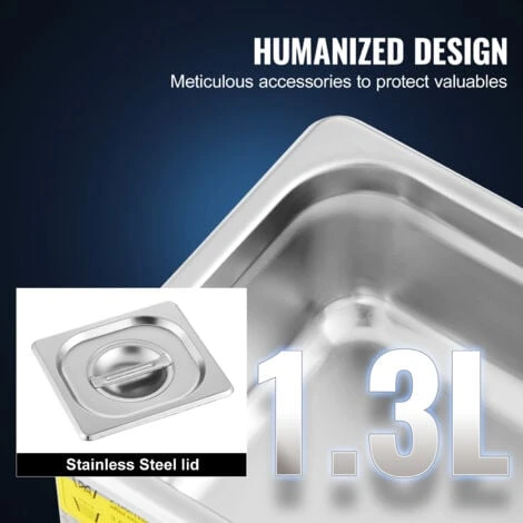- Materiau Premium SUS304: Taille du reservoir : 1-1,3 L ; puissance ultrasonique : 60 W. Cette machine de nettoyage a ultrasons est construite avec de lacier inoxydable 304 robuste, aucune fuite deeau et une longue duree de vie.