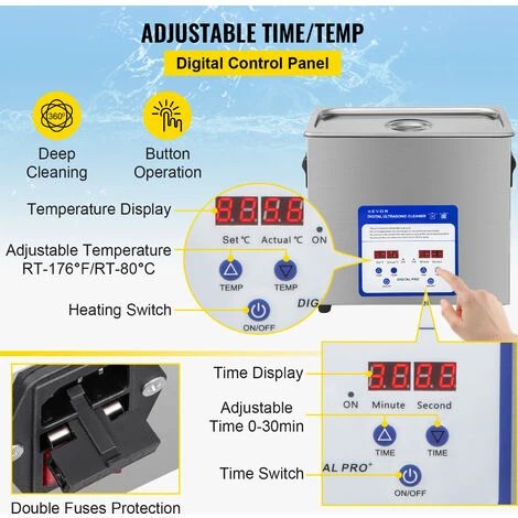 - 【PANNEAU DE COMMANDE NUMERIQUE】 – Le nettoyeur ultrasonique professionnel comprend un panneau de commande numerique, avec une minuterie reglable (0 – 30 min) et un chauffage (RT-176℉ / RT-80℃) affiches sur lecran LCD. Une fonction de chauffage peut efficacement ramollir et dissoudre les taches dehuile et de cire, ameliorant ainsi leffet de nettoyage.