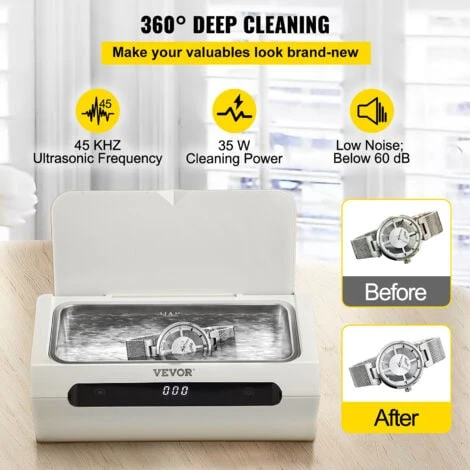 - Ondes de 45 kHz & Transducteur de 35 W : Grace aux ondes ultrasoniques de 45 kHz, au transducteur de 35 W et au nettoyage en profondeur a 360°, toutes les crevasses et les impuretes peuvent etre facilement nettoyees. Le nettoyeur a ultrasons numerique fait briller a nouveau vos lunettes, bagues, montres et pieces de monnaie en quelques minutes.